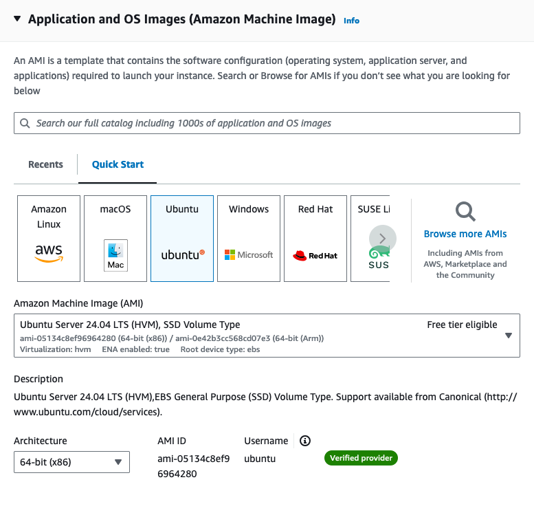 - Next you will choose the Amazon Machine Image (AMI). An AMI is a template that contains the software configuration (operating system, application server, and applications) required to launch your instance. Select Ubuntu from the quick start menu, then make sure "Ubuntu Server 24.04 LTS" is selected in the box below. Leave the 64-bit architecture as it is.