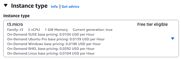 Choose an Instance Type which is free tier eligible (e.g., t3.micro, the default). Amazon EC2 provides a wide selection of instance types optimized to fit different use cases. Instances are virtual servers that can run applications.