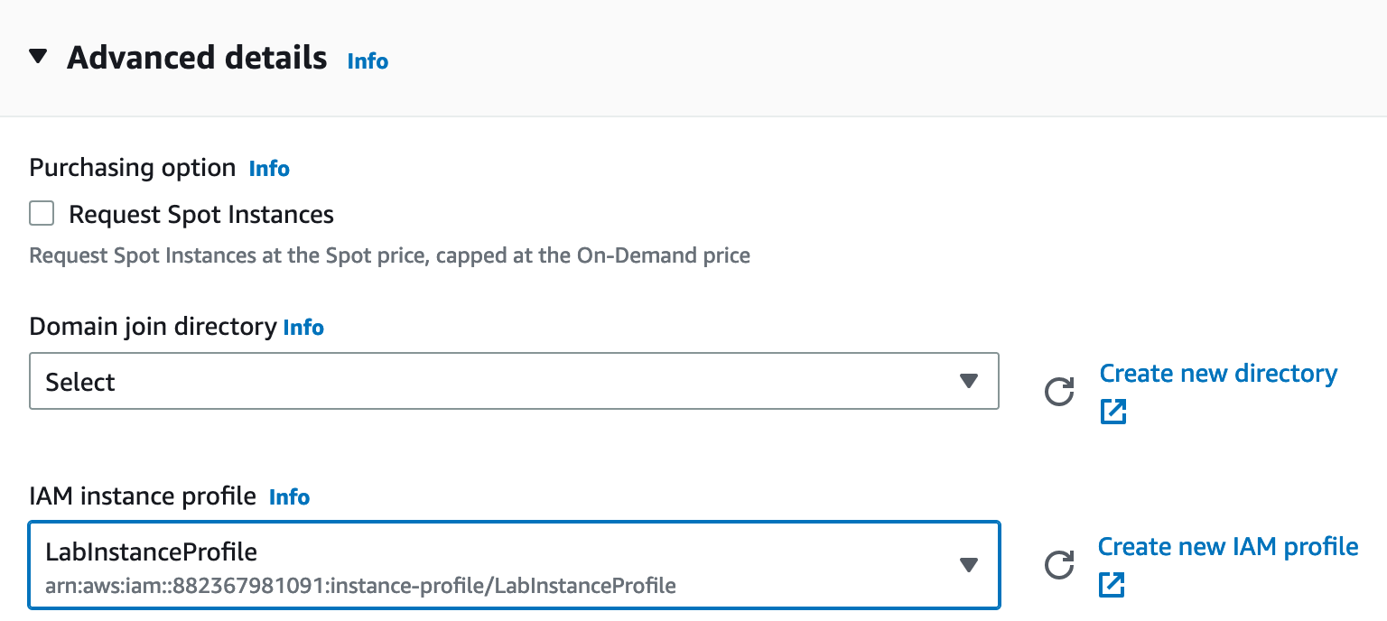 - Under Advanced details, under the option for IAM instance profile, select the option for