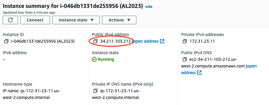 - On the instance summary page, make note of your Public IPv4 Address (34.211.103.212 in the screenshot). You will use this address to access your server. Wherever you see an IP address in the example commands below, use your public IPv4 address.