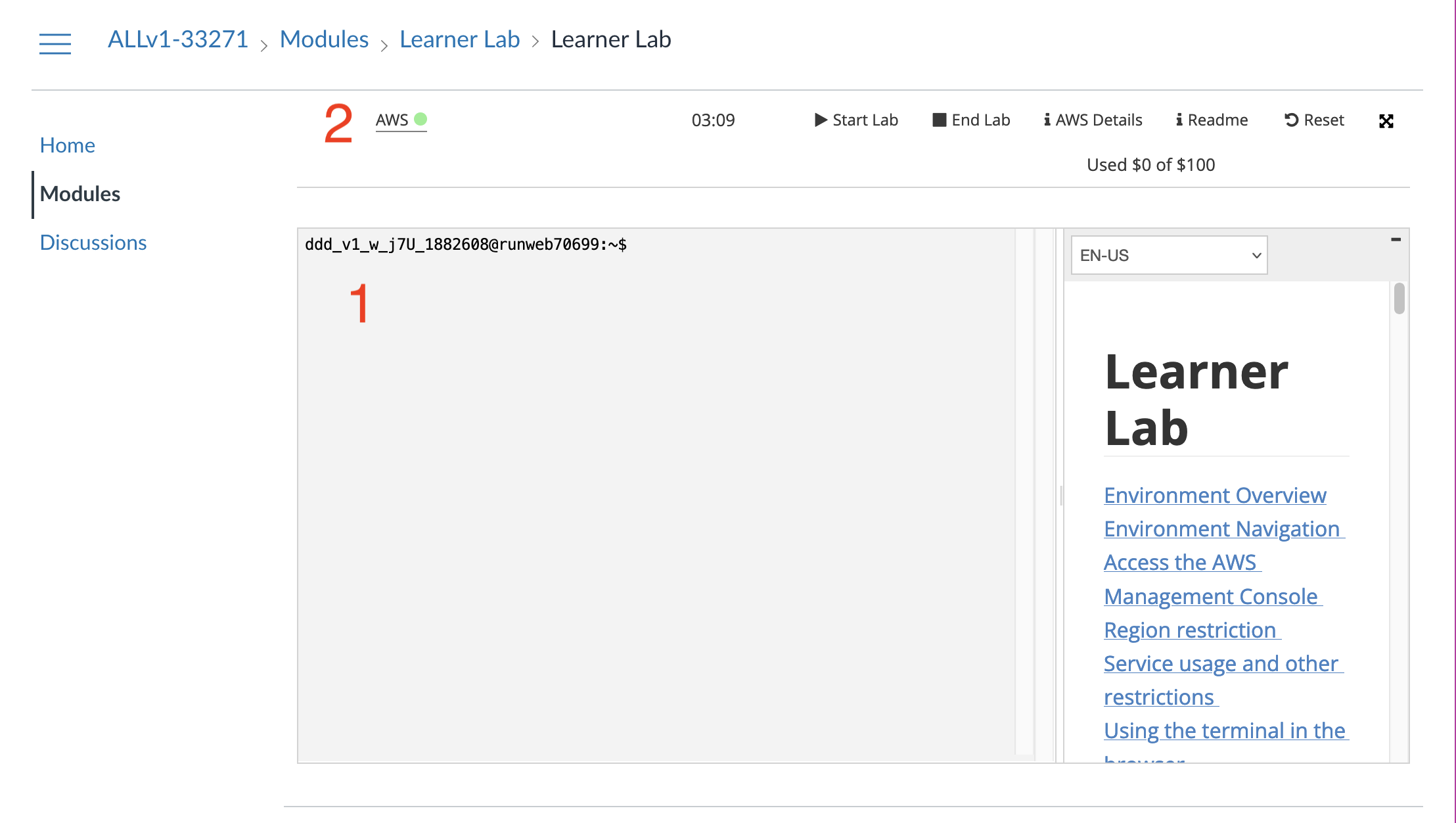 To start the lab, you will go to the modules page of the Learner Lab course. Once there, you can click the Learner Lab link. You may have to turn off your adblocker to enable this page to function.