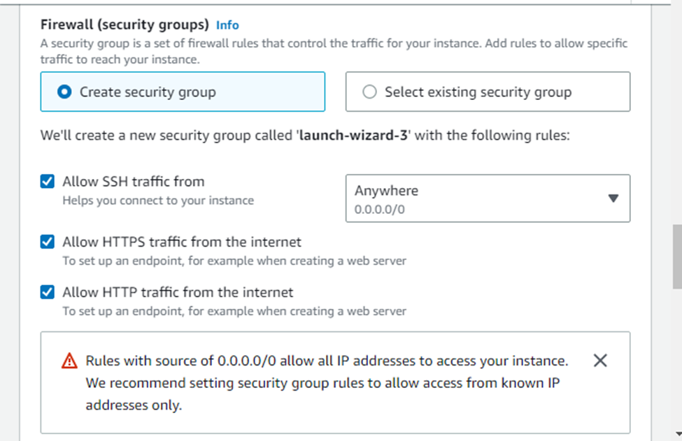 Under the network and firewall settings, create a new security group and check the boxes to allow SSH traffic from anywhere, and HTTP traffic from the internet. We won’t worry about HTTPS for this server just yet, but we’ll get there later. A security group is a set of rules that control the traffic for your instance. On this page, you can add rules to allow specific traffic to reach your instance. For example, if you want to set up a web server and allow Internet traffic to reach your instance, add rules that allow unrestricted access to the HTTP and HTTPS ports.