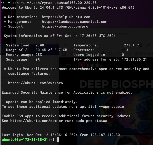 chmod 400 ~/.ssh/labsuser.pem- Type the ssh command. Make sure you replace the IP address with the IP address of your server.